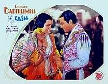 The Lash is a 1930 American Pre-Code drama film produced and distributed by First National Pictures, a subsidiary of Warner Bros. It had an alternate title of Adios. The film was directed by Frank Lloyd and stars Richard Barthelmess, Mary Astor, James Rennie and Marian Nixon. The film was issued in two formats: Warner Bros. 65mm Vitascope wide screen and regular 35mm. The Vitaphone sound system was used for recording. Exteriors were filmed at the current Westlake Village, California and Russell Ranch of Thousand Oaks, California areas near Los Angeles. It was adapted for the screen by Bradley King from a story Adios by Fred Bartlett and Virginia Stivers Bartlett.[1][2]