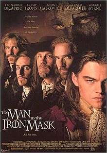 The Man in the Iron Mask is a 1998 American action drama film directed, produced, and written by Randall Wallace, and starring Leonardo DiCaprio in a dual role as the title character and villain, Jeremy Irons as Aramis, John Malkovich as Athos, Gerard Depardieu as Porthos, and Gabriel Byrne as D'Artagnan.[3] The picture uses characters from Alexandre Dumas' D'Artagnan Romances and is very loosely adapted from some plot elements of The Vicomte de Bragelonne.