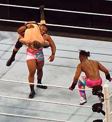 From the November 3 episode of Raw, WWE began airing vignettes for Big E, Kingston, and Woods, with the stable now being billed as "The New Day", displaying a babyface black gospel gimmick.[15] The New Day made their in-ring debut on the November 28 episode of SmackDown in a winning effort against Titus O'Neil, Heath Slater, and Curtis Axel.[16] On the December 1 episode of Raw, Woods and Kingston competed in a tag team turmoil match to determine the number one contenders for the WWE Tag Team Championship, eliminating Goldust and Stardust, before being eliminated by Tyson Kidd and Cesaro.[17] On the December 5 episode of SmackDown, Woods and Kingston defeated Kidd and Cesaro with a pendulum backbreaker and diving double foot stomp combination.[18][19] At the TLC kickoff show, Big E and Kingston defeated Goldust and Stardust.[20]