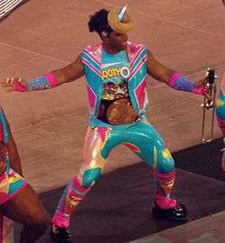 Upon transitioning away from the gospel aspect, The New Day developed their own unique identity of frequently excited proponents of positivity, which sees them usually encourage live audiences to clap along with them.[58][59][60] In 2015, Woods began bringing a trombone to the ring and playing it during the group's entrance and matches, later naming the trombone Francesca; after "she" was destroyed by Chris Jericho, Woods replaced her by her sister Francesca II in January 2016; he also introduced her Scottish cousin Agnes (bagpipes) at a Scotland show on November 2016.[61] Following Francesca II's destruction, she was replaced by Francesca II: Turbo, a nod to Street Fighter II: Turbo. Also in late 2015, a unicorn pony was incorporated into The New Day's newest shirt,[62] and the trio began making unicorn gestures, using their fingers as horns and even having interviewers claiming to perceive them having "unicorn magic".[63] The group later began wearing plastic unicorn horns during their ring entrance. One of their assault tactics was also named after this theme.[64] Also in 2015, The New Day began using the word "booty" as their catchphrase and began occasionally using it to mock other wrestlers and the host city where WWE events would take place, such as calling Birmingham "Bootyham". In 2016, The New Day introduced their "Booty-O's" cereal, while claiming that "They make sure you ain't booty", and even had a giant "Booty-O's" box at WrestleMania 32 as part of their entrance, and later "Booty-O's" shirts were created and were a very lucrative success.
