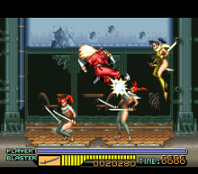 The player will advance through eight levels fighting large numbers of enemies, often being stopped from advancing until all enemies on the screen are defeated. Enemies can approach the player from the left and right sides of the screen and have the ability to move off screen, while the player cannot. At the end of each level, as common in beat 'em up games, the player must defeat a boss.[1] The North American and European versions of the game were censored (changes made to the original Japanese version include removal of the female ninja enemies and replacing them with clawed enemies wearing pink wardrobe, and the removal of the bright green blood entirely when Kunoichi and Kamaitachi attack).[2][3][4] The European version, published by Titus Software, is also noticeably slower and easier than the other two.[5] The game was notorious for its high difficulty.[1]