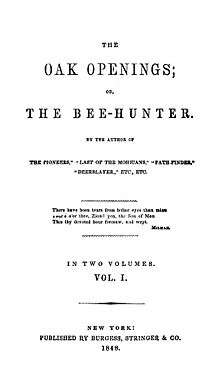 The Oak Openings; or, The Bee Hunter is an 1848 novel by James Fenimore Cooper. The novel focuses on the activities of professional honey-hunter Benjamin Boden, nicknamed "Ben Buzz". The novel is set in Kalamazoo, Michigan's Oak Opening, a wooded prairie that still exists in part today,[1][2] during the War of 1812.[3]