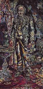 The painting entitled Picture of Dorian Gray[4] used in the film was painted on commission during the making of the film in 1943-1944 by Ivan Le Lorraine Albright, an American artist who was well known as a painter of the macabre. Created specifically for use in the film, it is now part of the art collection of The Art Institute of Chicago. Albright had to paint the picture while the movie was being made in order to show Dorian Gray's physical transformation as his evil actions changed him into a horrid image in the painting, while his actual physical appearance remained that of a young man. At the film's climax, Gray "killed" the painting by piercing it through its heart with a knife, thus killing himself when his physical appearance changed to that of the painting.