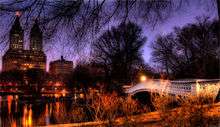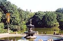 The Ramble and Lake is a main feature of Central Park in New York City. Part of Frederick Law Olmsted and Calvert Vaux's "Greensward" plan (1857), The Ramble was intended as a woodland walk through highly varied topography, a "wild garden" away from carriage drives and bridle paths, to be wandered in, or to be viewed as a "natural" landscape from the formal lakefront setting of Bethesda Terrace (illustration below) or from rented rowboats on the Lake. The 38-acre (150,000 m2) Ramble embraces the deep coves of the north shore of the Lake, excavated between bands of bedrock; it offers dense naturalistic planting, rocky outcrops of glacially scarred Manhattan bedrock, small open glades, and an artificial stream (The Gill) that empties through the Azalea Pond, then down a cascade into the Lake. Its ground rises northwards towards Vista Rock, crowned by Belvedere Castle, a lookout and eye-catching folly.[1][2]
