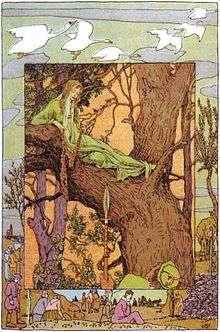 The Six Swans (in German : Die sechs Schwäne) is a German fairy tale collected by the Brothers Grimm[1] as tale number 49. Andrew Lang included a variant in The Yellow Fairy Book.[2] It is Aarne-Thompson type 451: the brothers who were turned into birds.[3] Other tales of this type include The Magic Swan Geese, The Seven Ravens, The Twelve Wild Ducks, Udea and her Seven Brothers, The Wild Swans, and The Twelve Brothers.[4]