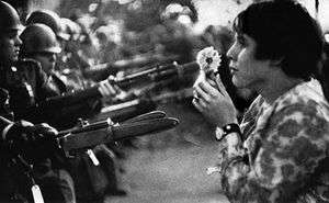 "The Ultimate Confrontation: The Flower and the Bayonet" is a photograph of Jan Rose Kasmir (born in 1950), at that time an American high-school student, taken by French photographer Marc Riboud.[1] Riboud photographed Kasmir on 21 October 1967 while taking part with several thousand anti-war activists in the National Mobilization Committee to End the War in Vietnam's march to The Pentagon to protest U.S. involvement in Vietnam. Seventeen-year-old Kasmir was shown clasping a chrysanthemum and gazing at bayonet-wielding soldiers. The photo was featured in the December 30, 1969 special edition of Look magazine under the title The Ultimate Confrontation: The Flower and the Bayonet.[2] The photo was republished world-wide and became a symbol of the flower power movement. Smithsonian Magazine later called it "a gauzy juxtaposition of armed force and flower child innocence".[3]