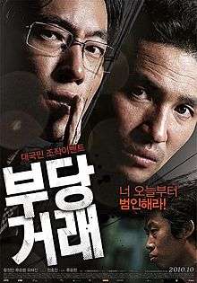 The Unjust (Hangul: 부당거래; RR: Budanggeorae; lit. "Bad deal" or "Unfair trade") is a 2010 South Korean crime film by Ryoo Seung-wan.[2][3][4] It is a dark and bitter denunciation of corruption in the South Korean justice system.[5][6]
