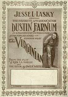 The Virginian is a 1914 American silent western film based upon the novel The Virginian by Owen Wister. The film was adapted from the successful 1904 theatre play Wister had collaborated on with playwright Kirke La Shelle. The Virginian starred Dustin Farnum[1] in the title role [2] and was directed by Cecil B. DeMille.[3]