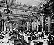 The Waldorf gained significant renown internationally for its fundraising dinners and balls, regularly attracting notables of the day such as Andrew Carnegie, who became a fixture.[30] Banquets were often held in the ballroom for esteemed figures and international royalty. The Waldorf Astoria was influential in advancing the status of women, who were admitted singly without escorts. George Boldt's wife, Louise Kehrer Boldt, was influential in evolving the idea of the grand urban hotel as a social center, particularly in making it appealing to women as a venue for social events. On February 11, 1899, Oscar hosted a lavish dinner reception that the New York Herald Tribune cited as the city's costliest dinner at the time. Some $250 was spent per guest, with bluepoint oysters, green turtle soup, lobster, ruddy duck and blue raspberries.[31] One article that year claimed that at any one time the hotel had $7 million worth of valuables locked in the safe, testament to the wealth of its guests.[32] In 1902 a lavish dinner was organized for Prince Henry of Prussia, and in 1909 banquets, attended by hundreds, were organized for Arctic explorer Frederick Cook in September and Elbert Henry Gary, a founder of US Steel, the following month.[33][34]