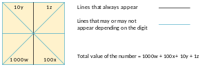 The system uses a vertical straight line as its main symbol. This symbol is essentially an axis that divides the two-dimensional plane into four quadrants. Each of these four quadrants signifies one of the four digits. The number can then be determined by visual inspection.[2][3]