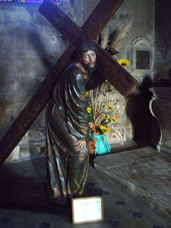 | This work depicting Christ carrying the Cross is located in the chapel of Notre-Dame de Pitié in the église Saint-Laurent in Pont à Mousson. It was carved from wood and then polychromed. It is thought to have come from the chapel of "Mount Olive" erected by Philippe de Gueldres in the garden of the Clarisses monastery in Pont-à-Mousson.[2][32] |