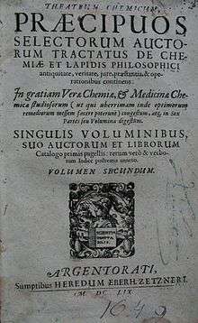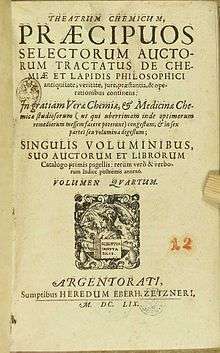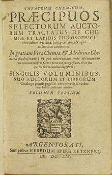 Theatrum Chemicum ("Chemical Theatre") is a compendium of early alchemical writings published in six volumes over the course of six decades. The first three volumes were published in 1602, while the final sixth volume was published in its entirety in 1661. Theatrum Chemicum remains the most comprehensive collective work on the subject of alchemy ever published in the Western world.[1][2][3]