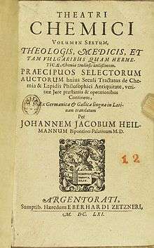 - ↑ Roughly translated as "Chemical Theatre, for a particularly selected person responsible for handling about Chemicals and the Philosopher's Stone. Ancient, truthful, pure, excellent, and working, containing: An account of True Chemicals, and the study of Medical Chemicals (how to most fruitfully accomplish the best remedy) brought together as parts in arrangement.