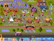 Starting with a free plot of land in the United Kingdom and few hundred thousand pounds, the player must build a profitable amusement park.[1] Money is spent on building rides, shops, and staff,[2] and earned through sale of entry tickets, merchandise, and refreshments.[3] Shops available include those selling foodstuff (such as ice creams) or soft drinks, and games such as coconut shies and arcades.[4] Their attributes can be customised, which may affect customers' behaviour: for example, affecting the flavour of foods (e.g. by altering the amount of sugar an ice cream contains) may affect customers' enticements to return.[5] Facilities such as toilets, and items that enhance the park's scenery (such as trees and fountains) can be purchased.[6] Over thirty attractions, ranging in complexity from the bouncy castle, to aeroplane flying, and more complicated and expensive rides such as the roller coaster and Ferris wheel are available. Also available as rides are shows (called 'acts') with themes such as clowns and mediaeval.[7] Certain rides, such as roller coasters, require a track to be laid out.[8] The ride complement varies between platforms: for example, the PlayStation version is missing the mediaeval and dolphin shows.[9] Rides require regular maintenance: if neglected for too long they will explode.[10] Depending on the platform, it is possible to tour the park or the rides.[11][12]