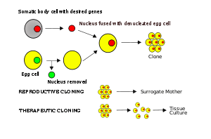 In genetics and developmental biology, somatic cell nuclear transfer (SCNT) is a laboratory strategy for creating a viable embryo from a body cell and an egg cell. The technique consists of taking an enucleated oocyte (egg cell) and implanting a donor nucleus from a somatic (body) cell. It is used in both therapeutic and reproductive cloning. Dolly the Sheep became famous for being the first successful case of the reproductive cloning of a mammal.[1] "Therapeutic cloning" refers to the potential use of SCNT in regenerative medicine; this approach has been championed as an answer to the many issues concerning embryonic stem cells (ESC) and the destruction of viable embryos for medical use, though questions remain on how homologous the two cell types truly are.