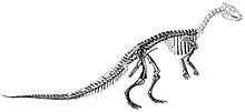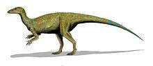 Thescelosaurs had short, broad, five-fingered hands, four-toed feet with hoof-like toe tips, and a long tail braced by ossified tendons from the middle to the tip, which would have reduced the flexibility of the tail.[8] The rib cage was broad, giving it a wide back, and the limbs were robust.[7] The animals may have been able to move on all fours, given its fairly long arms and wide hands,[9] but this idea has not been widely discussed in the scientific literature, although it does appear in popular works.[10][11] Charles M. Sternberg reconstructed it with the upper arm oriented almost perpendicular to the body,[7] another idea that has gone by the wayside. As noted by Peter Galton, the upper arm bone of most ornithischians articulated with the shoulder by an articular surface that consisted of the entire end of the bone, instead of a distinct ball and socket as in mammals. The orientation of the shoulder's articular surface also indicates a vertical and not horizontal upper arm in dinosaurs.[12]