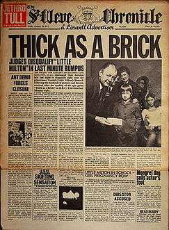 Jethro Tull's official website states about the mock-newspaper: "There are a lot of inside puns, cleverly hidden continuing jokes (such as the experimental non-rabbit), a surprisingly frank review of the album itself [written by Anderson under a pseudonym], and a little naughty connect-the-dots children's activity." The "newspaper", dated 7 January 1972, also includes the entire lyrics to "Thick as a Brick" (printed on page 7), which is presented as a poem written by Bostock,[12] whose disqualification from a poetry contest is the focus of the front page story. This article claims that although Bostock initially won the contest with "Thick as a Brick", the judges' decision was repealed after a multitude of protests and threats concerning the offensive nature of the poem, furthered by allegations of the boy's psychological instability.[15] In addition to this, the front cover includes another short article where Bostock is investigated as the father of his 14-year-old friend Julia's child, although this has been cropped out of many renditions of the cover.[16] (The section of the photograph that includes Julia's pose for the camera is often cropped out as well.)
