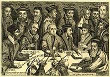 The themes of other engravings were based on sermons preached in London, and exhibit anti-Catholic feeling. There is possibly allusion to the Fatal Vespers.[16] The preachers of the sermons are indicated by two initials only.[17] It has been argued that in particular the 27th engraving, "The new creation", with imagery based on an untuned musical instrument, could have been taken from preaching of John Donne.[18]