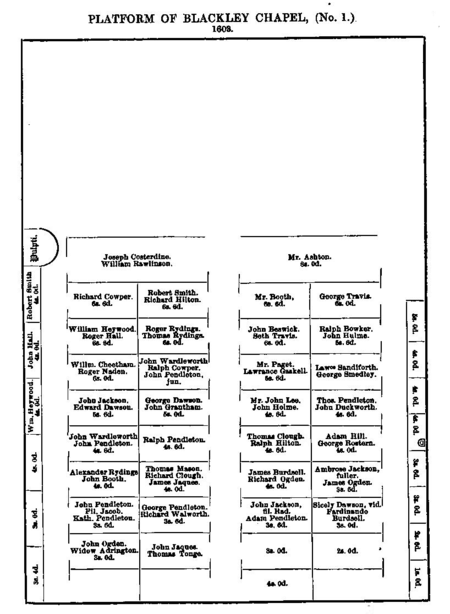 Paget's income was drawn from the pew rents and offerings of his congregation.[9] The rent was due in quarterly instalments, as an episcopal confirmation of 1631 makes clear: the collection dates were Christmas (25 December]], Annunciation (25 June), John the Baptist's Day (24 June) and Michaelmas (29 September).[22] This was just after Paget left, as the clerk at the time was his successor, William Rathband.[23] A plan, dated 1603, shows the layout and rentals of the pews, with the most expensive, nearest the front, being 8 shillings.[24] One of the seats is assigned to Mr Paget, giving rise to the belief that Thomas Paget was minister at Blackley in 1603. The minister at that date was Oliver Carter, who served from 1598 until his death in March 1605,[25] and Paget's university admission date makes it impossible that he was serving in Manchester in 1603: there is an unexplained discrepancy in the sources. The plan gives considerable insight into who were the key lay supporters of the Puritan preaching at Blackley, with the Travis family still featuring strongly.[11] It seems that lay offerings and support were considerable, as the old building was completely renovated during Paget's incumbency.[26] Sometimes Paget, like other ministers, benefited from bequests, as in 1624, when Judith Foxe left him 20 shillings in her will,[27] as well as various sums for other ministers and more to be distributed by Bourne. Depending on this strong congregational base, the Presbyterian ministers also seem to have attempted a form of regional voluntary presbytery. Richard Hollinworth, a 17th-century Manchester Presbyterian minister, reports in his Mancuniensis that Bourne, with Paget and other ministers he approved, "often mett in a kind of consultatiue classis."[28] They also took part together in preaching exercises, in which two or more sermons would be delivered at a particular chapel, with visiting preachers adding variety.