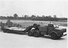 At this time, the intention was that the even heavier Conqueror tank would be transported by a whole new transporter of equally large capacity, the Leyland FV 1000.[4] This was 2 feet (61 cm) wider than the Antar, as the Antar had in turn been 2 feet (61 cm) wider than the Diamond T. They were to be equipped with a semi-trailer of 60 tons capacity, given the design number FV 3301. This design was ungainly and top-heavy when loaded, being high at the rear to clear the wheels and sloping downwards towards the front to better place the weight of the load.