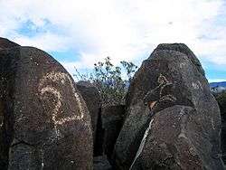 There are over 21,000 petroglyphs at the Three Rivers Petroglyph Site at Three Rivers, New Mexico,[1] located midway between Tularosa and Carrizozo in Otero County on Highway 54. Many of the petroglyphs can be easily viewed from a trail open to the public which winds through the rocks for about one mile. The petroglyphs are thought to be the product of the Jornada Mogollon people between about 1000 and 1400 AD. The site is protected and maintained by the Bureau of Land Management.