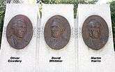 The joint statement of the Three Witnesses—Oliver Cowdery, Martin Harris, and David Whitmer—has been printed (with a separate statement by the Eight Witnesses) in nearly every edition of the Book of Mormon since its first publication in 1830. All three men eventually broke with Smith and the church he organized, although Harris and Cowdery were eventually rebaptized into the church after Smith's death.[2][3] Whitmer founded his own Church of Christ (Whitmerite). All three men upheld their testimony of the Book of Mormon at their deaths.[4][5]