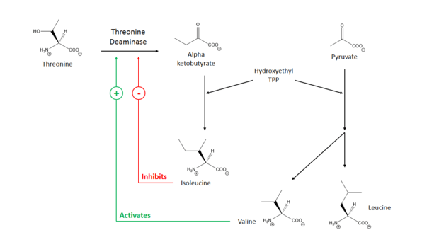 Threonine ammonia-lyase has been shown to not follow Michaelis-Menten kinetics, rather, it is subject to complex allosteric control.[11] The enzyme is inhibited by isoleucine, the product of the pathway it participates in, and is activated by valine, the product of a parallel pathway.[1] Thus, an increase in isoleucine concentration shuts off its production, and an increase in valine concentration diverts starting material (Hydroxyethyl-TPP) away from valine production. The enzyme has two binding sites for isoleucine; one has a high affinity for isoleucine and the other has a low affinity.[12] The binding of isoleucine to the high affinity site increases the binding affinity of the low affinity site, and enzyme deactivation occurs when isoleucine binds to the low affinity site. Valine promotes enzyme activity by competitively binding to the high affinity site, preventing isoleucine from having an inhibitory effect.[12] The combination of these two feedback methods balances the concentration of BCAAs.