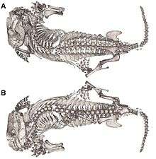 Similar to other synapsids, Thrinaxodon adopted a semi-sprawling posture, an intermediary form between the sprawling position of pelycosaurs (not unlike current Crocodylia) and the more upright posture present in current mammals.[2] Thrinaxodon is prevalent in the fossil record in part because it was one of the few carnivores of its time, and was of a larger size than similar cynodont carnivores.[3] It was a small synapsid ranging in size between 30 cm and 50 cm.