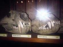 Lions' skulls rival those of tigers in size[33] or length (Pease, 1913, page 101),[84] with even the largest known skulls of tigers being smaller than the largest known skulls of lions, albeit slightly. Apart from their sizes, the skulls of lions and tigers are generally similar, with there being differences in structural features of the lower jaws, relative lengths of their noses,[6] and the frontal regions.[35] Their skulls were so similar that Heptner and Sludskii (1972) argued that the lion was the closest relative of the tiger, not the leopard or jaguar, unlike what others believed.[6][91]
