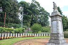 Tillicoultry War Memorial: a traditional figure on a plinth for WW1 but surrounded by a series of individual stones, in a henge style, by Pilkington Jackson added in 1949 for those lost in WW2