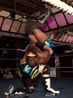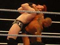 A backbreaker refers to professional wrestling moves which see a wrestler dropping an opponent so that the opponent's back impacts or is bent backwards against a part of the wrestler's body, usually the knee.[1] The standard version of the move sees the wrestler scoop their opponent horizontally before dropping to one knee, slamming the opponent's back on their other knee.