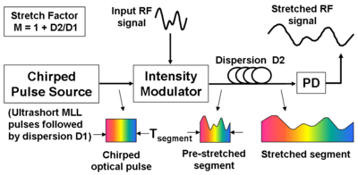An optical front-end is commonly used to accomplish this process of time-stretch. An ultrashort optical pulse (typically 100 to 200 femtoseconds long), also called a supercontinuum pulse, which has a broad optical bandwidth, is time-stretched by dispersing it in a highly dispersive medium (such as a dispersion compensating fiber). This process results in (an almost) linear time-to-wavelength mapping in the stretched pulse, because different wavelengths travel at different speeds in the dispersive medium. The obtained pulse is called a chirped pulse as its frequency is changing with time, and it is typically a few nanoseconds long. The analog signal is modulated onto this chirped pulse using an electro-optic intensity modulator. Subsequently, the modulated pulse is stretched further in the second dispersive medium which has much higher dispersion value. Finally, this obtained optical pulse is converted to electrical domain by a photodetector, giving the stretched replica of the original analog signal.