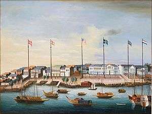 Painting of the Thirteen Factories c. 1820, with flags of Denmark, Spain, the U.S., Sweden, Britain, and the Netherlands