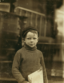 By the end of the 19th century, American children worked in large numbers in mines, glass factories, textiles, agriculture, canneries, home industries, and as newsboys, messengers, bootblacks and peddlers.[3]