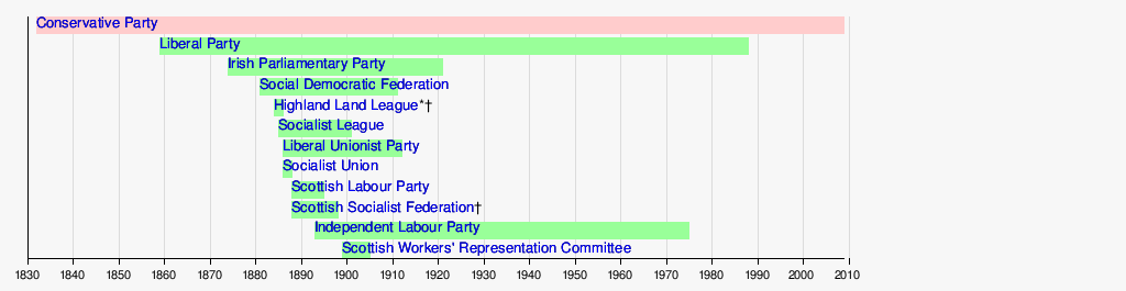 The following timeline of political parties in the United Kingdom shows the period during which various parties were active, from their date of establishment to their date of dissolution. Defunct parties are shown in green, and currently active parties are shown in pink. An asterisk or dagger indicates that the exact year of establishment or dissolution, respectively, is not certain. Where a party has changed its name over the course of its existence, only the most recent name is given.