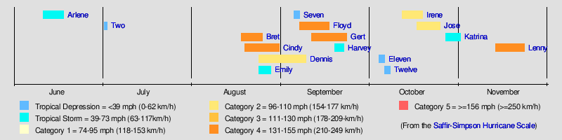 The Timeline of the 1999 Atlantic hurricane season documents all the storm formations, strengthening, weakening, landfalls, extratropical transitions, as well as dissipation. The timeline also includes information which was not operationally released, meaning that information from post-storm reviews by the National Hurricane Center, such as information on a storm that was not operationally warned on, has been included. The 1999 Atlantic hurricane season was slightly above average in terms of activity, with 12 tropical cyclones, 8 hurricanes, and 5 major hurricanes (hurricanes that are classified as Category 3 or higher).