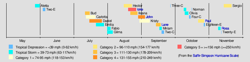 The first storm of the season, Tropical Storm Aletta, formed off the southwest coast of Mexico. After no storms formed in June, the season became active again in July when five named storms developed, including Hurricane Daniel, which was the second strongest storm of the season. Six storms formed during August, including Hurricane Ioke and Hurricane John. September was a relatively inactive month, producing only two storms, of which one was Hurricane Lane. Three storms developed in October and two formed in November; this marked the first time on record when more than one tropical storm developed in the basin during the month of November.