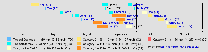 Hurricane Tomas Hurricane Shary (2010) Hurricane Richard (2010) Hurricane Paula (2010) Hurricane Otto (2010) Tropical Storm Nicole (2010) Tropical Storm Matthew (2010) Hurricane Karl (2010) Hurricane Julia (2010) Hurricane Igor Tropical Storm Hermine (2010) Hurricane Earl (2010) Hurricane Danielle (2010) Tropical Depression Five (2010) Tropical Storm Colin (2010) Tropical Storm Bonnie (2010) Tropical Depression Two (2010) Hurricane Alex (2010) Saffir–Simpson hurricane scale