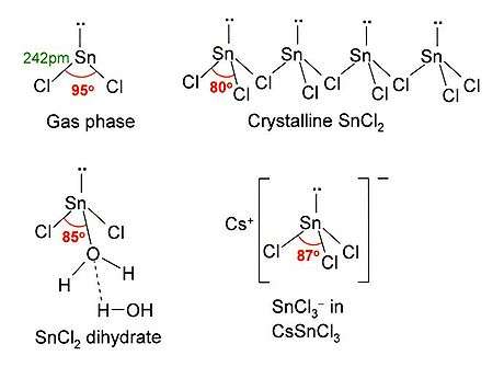 SnCl2 has a lone pair of electrons, such that the molecule in the gas phase is bent. In the solid state, crystalline SnCl2 forms chains linked via chloride bridges as shown. The dihydrate is also three-coordinate, with one water coordinated on to the tin, and a second water coordinated to the first. The main part of the molecule stacks into double layers in the crystal lattice, with the "second" water sandwiched between the layers.