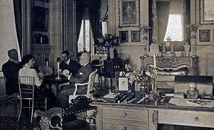 During these years, Tirso and his family maintained their close relations with Carlos VII's family and were frequent visitors to the Palazzo Loredan in Venice. At least in 1905 he ventured to enter Spain, again accompanying Don Jaime during his visit to Covadonga.[186] Also later he kept feeding the press with news about royal whereabouts,[187] but during the 1907 trip it was already his son Rafael accompanying Don Jaime.[188] It seems that his sons have already started to assume some of his tasks and it is indeed difficult to tell which Olazábal is referred to in various press notes from that period.[189] Tirso is known to have exchanged vast correspondence with other Carlist leaders[190] and upon death of the then Jefe Delegado Matías Barrio in 1909 he was invariably reported by the press as one of his potential successors; though the job went to Bartolomé Feliu instead.[191]