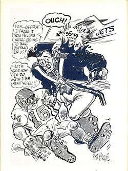 The Jets' success in signing Namath and the rise of the team in the standings adversely affected their crosstown rivals, the Giants, who had played in five NFL championship games in six years to 1963, but who thereafter declined in the standings. Giants owner Wellington Mara stated, "I think the Jets coming in when they did contributed to our bad years, because we tried to do everything for the short term rather than the long haul—we'd trade a draft choice for a player, figuring he'd give us one or two good years. We didn't want to accept how the public might react if we had a bad year or two or three."[72] In 1968, the Giants traded for star Minnesota Vikings quarterback Fran Tarkenton in the vain hopes he would lead them to renewed success and rival Namath in the public eye.[73] In August 1969, the Jets faced the Giants in a preseason game at the Yale Bowl.[74] While the Jets' Super Bowl win legitimized the AFL as a comparable league to the NFL in the eyes of many, others doubted the AFL's standard of play, and the Jets were underdogs going into the game.[75] Giants coach Allie Sherman approached the game as if it were a regular season contest, and the Jets sent the three remaining original Titans out for the coin toss.[74] The Jets defeated the Giants 37–14,[69] and Sherman was fired a few weeks later. The Jets' fellow tenants, the Mets, won a championship themselves; the baseball team's accomplishments forced the Jets to play their first five games on the road.[74] The Jets recovered from a slow start to win their second consecutive Eastern Division championship, but fell to Kansas City in the divisional round of the playoffs, 13–6.[69]