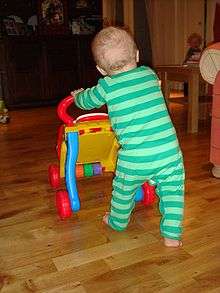 A toddler is a child 12 to 36 months old.[1][2][3] The toddler years are a time of great cognitive, emotional and social development. The word is derived from "to toddle", which means to walk unsteadily, like a child of this age.[4]