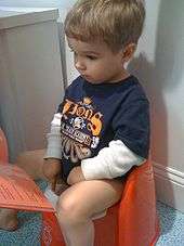 Toilet training, or potty training, is the process of training a young child to use the toilet for urination and defecation, though training may start with a smaller toilet bowl-shaped device (often known as a potty). Cultural factors play a large part in what age is deemed appropriate, with the expectation for being potty trained ranging from 12 months for some tribes in Africa[1] to 36 months in the modern United States.[2] Most children can control their bowel before their bladder, boys typically start and finish later than girls, and it usually takes boys longer to learn to stay dry throughout the night, however it depends on the maturity and consistency of the particular child.[3]