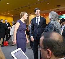 Miliband represented the UK at the 2009 Copenhagen Summit, from which emerged a global commitment to provide an additional US$10 billion a year to fight the effects of climate change, with an additional $100 billion a year provided by 2020.[36] The conference was not able to achieve a legally binding agreement. Miliband accused China of deliberately foiling attempts at a binding agreement; China explicitly denied this, accusing British politicians of engaging in a "political scheme".[37]