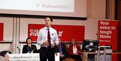 The Labour party conference in Manchester on 21–24 September occurred days after the Scottish referendum result. Miliband's conference speech was criticised, particularly after he missed sections on the deficit and immigration, after attempting to deliver the speech without notes.[77] At the conference, Miliband pledged to focus on six national goals for Britain until 2025, including boosting pay, apprenticeships and housing; a mansion tax and levy on tobacco companies to fund £2.5 billion a year 'time to care' fund for the NHS; a commitment to raise the minimum wage to £8 or more by 2020; and a promise to lower the voting age to 16 ready for elections in 2016.[78][79]