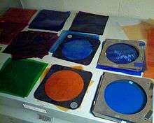 A colour frame or gel frame is a piece of folded material, made from either metal or cardboard, designed to hold colour media (gel).[2] Colour frames are placed directly outside the fixture, immediately in front of lens assembly. Most fixtures include an integrated holder for the frame. Some accessories designed to mount in the gel frame holder, such as Barn Doors, occasionally include an integrated replacement slot for frames.