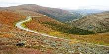 The Top of the World Highway is a 127-kilometre (79 mi) long highway, beginning at a junction with the Taylor Highway near Jack Wade, Alaska traveling east to its terminus at the ferry terminal in West Dawson, Yukon, on the western banks of the Yukon River. The highway has been in existence since at least 1955 and is only open during the summer months. The entire portion of the highway in Yukon is also known as Yukon Highway 9. The Alaska portion is short and apparently not numbered. The Alaska Department of Transportation refers to it as Top of the World Highway.[3]