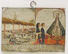 In the colonial period, tin was worked for its functional rather than aesthetic value. It was created and sold in standard sheets, which were then cut, folded and joined to make various objects. These sheets also became a traditional base for folk ex votos.[37] Today, tin and other sheet metals, often from industrial waste, is still used to create decorative and functional objects such as castles, churches, masks, airplane models, saints, nativity scenes, contains, mirror frames, chandeliers, lamps, trays and plates.[1][29][37] Another important line is toys, which are painted in bright enamels, especially in Celaya and San Miguel de Allende.[1] Other important centers include Oaxaca, Irapuato, Mexico City, Puebla, Tlaxcala and Tlaquepaque .[29]