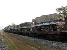 It is also possible to carry a railway wagon of one track gauge on a flat railway wagon (transporter wagon or rollbock) of another gauge; indeed, whole trains of one gauge can be carried on a train of flat wagons of another gauge, as was done in Australia for about a year around 1955 between Telford and Port Augusta.[5][6]