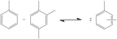 This type of reaction can also be performed with toluene and trimethylbenzene to produce xylene. The reaction occurs via equilibrium, so the product is not pure xylene. Many products are produced with varying numbers of methyl groups. The quantities in which each product is produced depends on the M/R ratio. This is the ratio of the number of methyl groups to the number of benzene rings in all of the substrates. For example, in the disproportionation of toluene, the M/R ratio is 1. Side reactions in which alkanes are produced reduce the number of methyl groups available which decreases the M/R ratio. This can be mitigated by adding compounds with higher numbers of methyl groups, such as trimethylbenzene. The ratio of products produced depends only on the M/R ratio so different starting materials can produce the same compounds via transalkylation.[3]